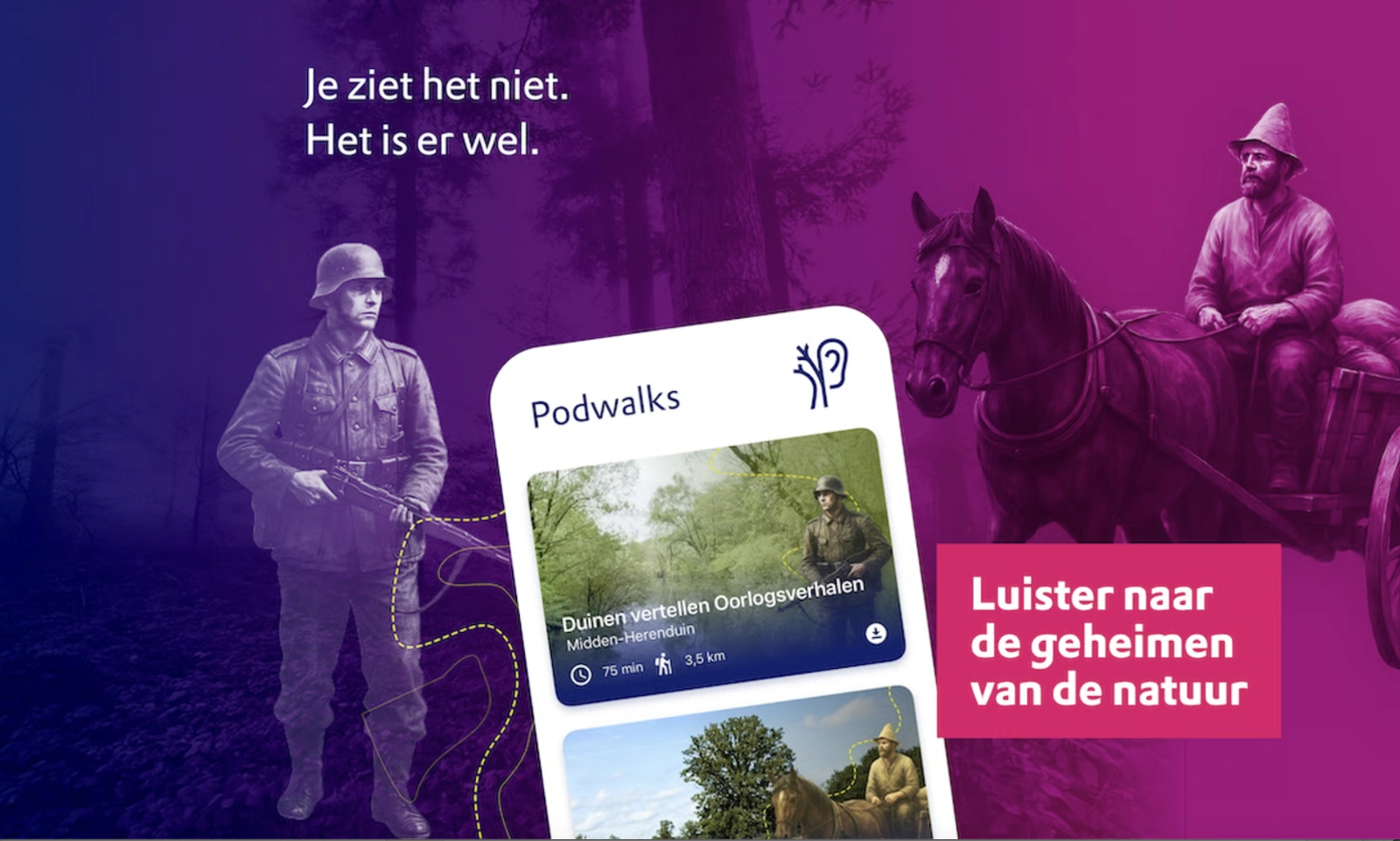 Een Podwalk is wandelen én luisteren. Oortjes in, telefoon in je zak: de natuur vertelt haar verhalen. Over mensen die hier vroeger leefden, mythes en legendes, vreugde en pijn.